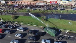Forcejeos y una corrida. Vuela el polvo, alguien grita y enseguida, el choque: pecheras contra chalecos antibalas, cascos y viseras de un lado, pañuelos cubriendo…