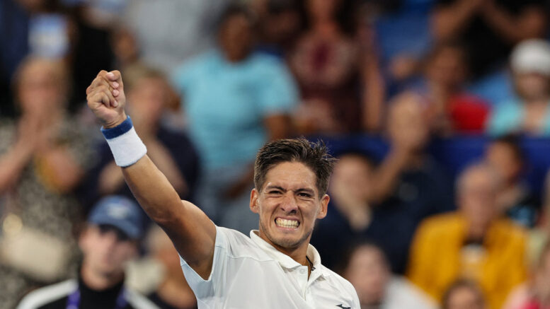 Argentina's Sebastian Baez celebrates victory over USA's Taylor Fritz at their men's singles match during the United Cup tennis tournament in Perth on January 3, 2026. (Photo by Antony DICKSON / AFP) / --IMAGE RESTRICTED TO EDITORIAL USE - STRICTLY NO COMMERCIAL USE--
