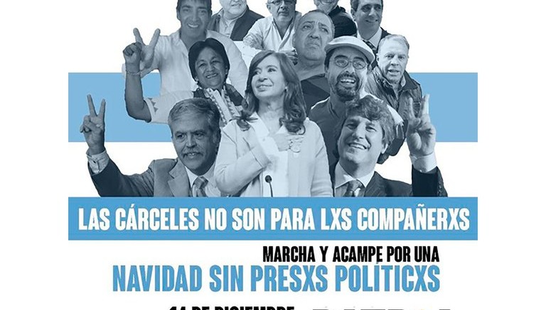 Ahora, sectores afines al kirchnerismo marcharán este 14 de diciembre exigiendo la libertad de los dirigentes que considera que son “presos políticos”. Una vez más busca apropiarse del concepto de preso político y apela a uno de los lemas utilizados durante la última dictadura cívico-militar: “Por una Navidad sin presos políticos”. Entre 1976 y 1983 dicha frase aparecía habitualmente pintada en las paredes por los distintos partidos políticos que eran perseguidos por el Gobierno de facto.