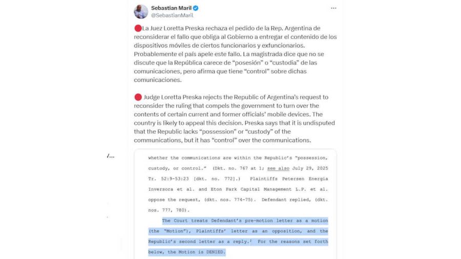 “La Juez Loretta Preska rechazó el pedido de la Argentina de reconsiderar el fallo que obliga al Gobierno a entregar el contenido de los dispositivos móviles de ciertos funcionarios y exfuncionarios. Probablemente el país apele este fallo. La magistrada dice que no se discute que la República carece de ‘posesión’ o ‘custodia’ de las comunicaciones, pero afirma que tiene ‘control’ sobre dichas comunicaciones”, detalló el analista en litigios internacionales Sebastián Maril.