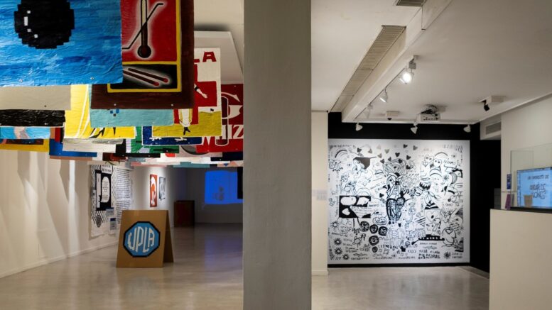 También al amor alude la muestra de La Gloriosa JPG, el colectivo que nació en las aulas de la Facultad de Arquitectura, Diseño y Urbanismo (FADU) de la Universidad de Buenos Aires, cuyo activismo se enfoca en la “militancia visual”.Pancartas, panfletos y afiches en la muestra Un poco de luz mi amor, del colectivo La gloriosa JPG. Foto: gentileza CCEBA.