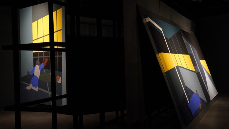 –Fue a partir de la invitación, que es como vengo trabajando desde hace un tiempo, ya que hay algo del espacio que voy a usar que me aporta la sala, puede ser la paleta, el tono emocional. Me gustan las instalaciones como idea de montar un espacio sobre otro ya existente, porque ves otra sala no sólo en el recorrido sino en el clima. Cuando comencé a trabajar, pensé en comprimir la altura repitiendo la estructura del techo que es compartimentada, de tonos negros y grises muy oscuros. Organicé el espacio creando estas organizaciones modulares que funcionan como grilla o reja y jaula en cierto modo, para condicionar la experiencia del espectador. Las pinturas se ven como interceptadas y aunque no suelo trabajar con la figura humana, aquí aparecen esos cuerpos esquematizados como en una gestualidad de la que no estamos seguros si son visiones o cuerpos materiales. En los últimos años una parte de sus instalaciones se activaba con lo performático de un cuerpo, que aportaba ciertos conceptos abstractos que no pueden ser expresados sino por el movimiento de alguien que comunica cosas. Van producirse también unas activaciones con el aporte de la bailarina Florencia Vecino en fechas a determinar. El cuerpo tiene esa capacidad de narrar emociones, de trabajar con lo abstracto abriendo imaginarios, trayendo universos sólo con una gestualidad precisa.