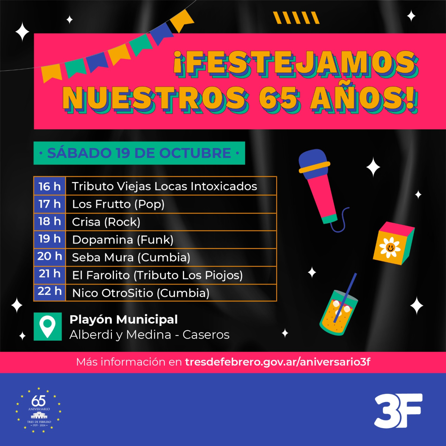 Festejamos los 65 años de nuestro querido Tres de Febrero con una fiesta imperdible en el Playón Municipal de Caseros (Alberdi y Medina) para que todos juntos vivamos tres días a pura diversión. Te esperamos desde el viernes 18 hasta el domingo 20 de octubre de 10.30 a 23 h.