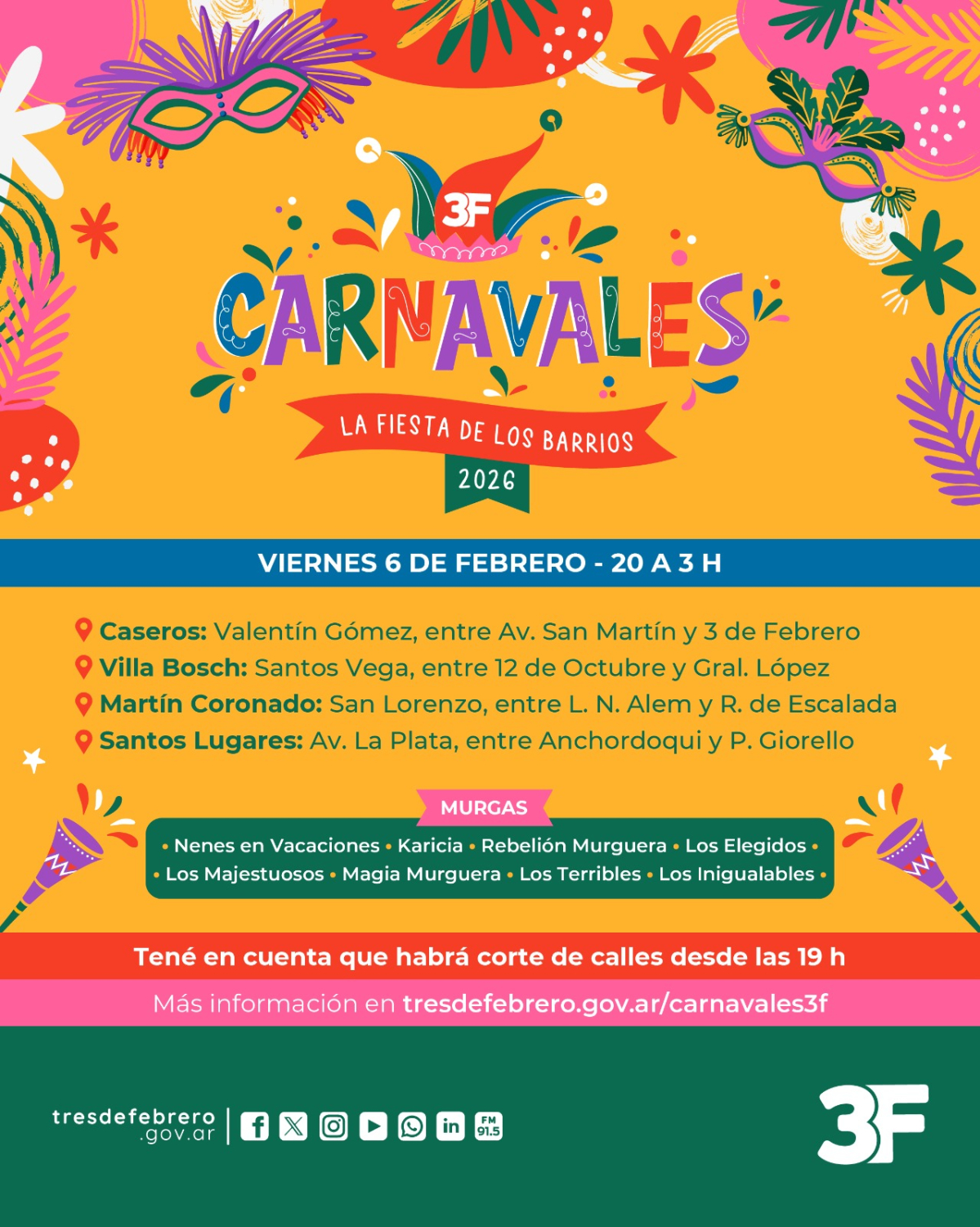 Los eventos se realizarán en los barrios de Caseros, Villa Bosch, Martín Coronado, Santos Lugares, Ciudadela y Sáenz Peña. Cada festival contará con propuestas gastronómicas y fiesta de la espuma. Algunas de las murgas que participarán son: Nenes en Vacaciones, Karicia, Magia Murguera y Los Terribles, entre otras.