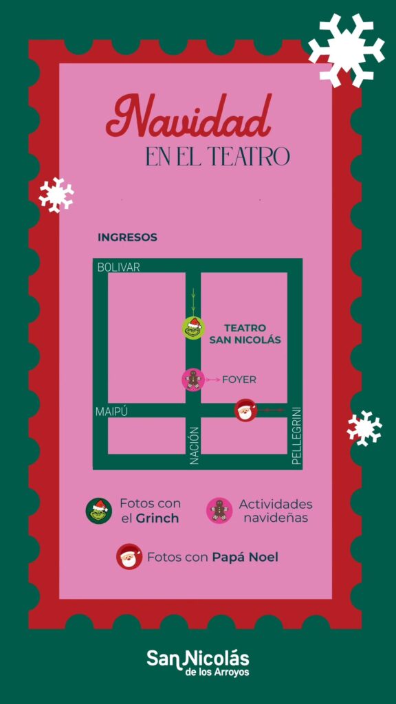 Desde la Municipalidad indicaron que el ingreso para las fotos con el Grinch será por calle Bolívar, mientras que para fotografiarse con Papá Noel se deberá acceder por Pellegrini. En tanto, las actividades navideñas se desarrollarán en el Foyer del teatro.