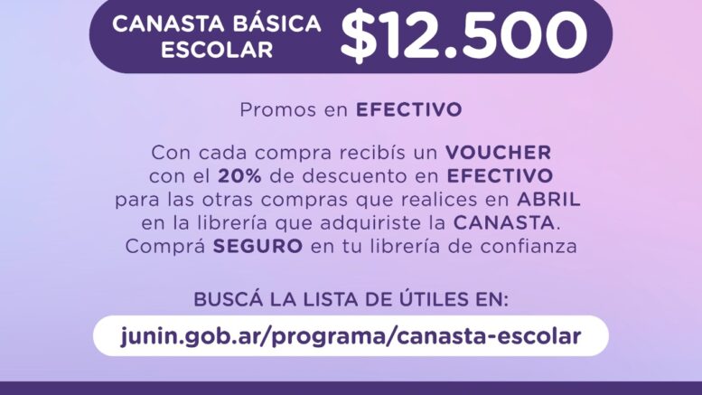 El Gobierno de Junín, a través de la Oficina Municipal de Información al Consumidor (OMIC), en conjunto con la Sociedad Comercio e Industria, anunciaron que se pone en marcha a partir del 15 de febrero, el programa Armá tu Mochila, para que los vecinos puedan acceder antes del inicio del ciclo lectivo 2025, a canastas escolares para todos los niveles, a precios accesibles. En un esfuerzo por parte de las librerías adheridas al programa por el contexto económico actual, las canastas conservan el precio del año pasado a un valor de $12.500 y contienen útiles y artículos para los niveles primario y secundario, los cuales se podrán adquirir en los comercios “Damasco”, “Bisio”, “Marial”, “Centro” y “JM”.