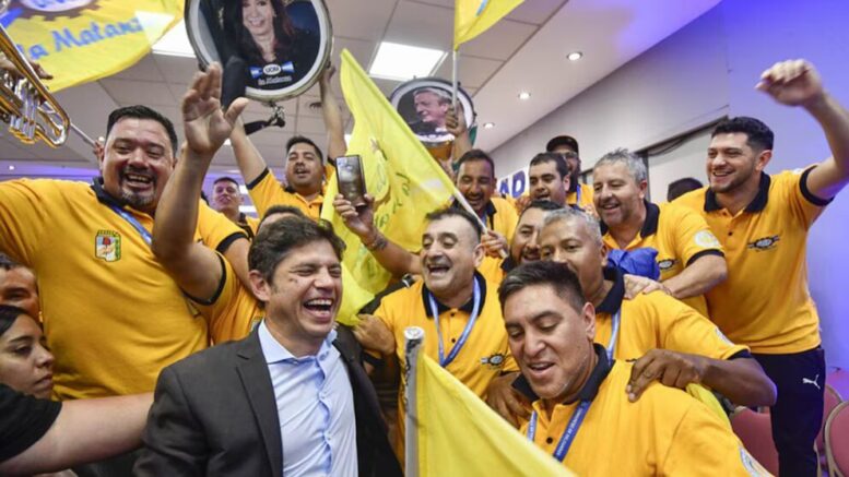 Entre las actividades que Kicillof encabezó ayer, hubo una que dejó una imagen muy simbólica. El Gobernador se ríe junto a dirigentes de la Unión Obrera Metalúrgica (UOM) y de fondo, arriba de él, aparecen dos bombos con los retratos de Néstor y Cristina Kirchner.