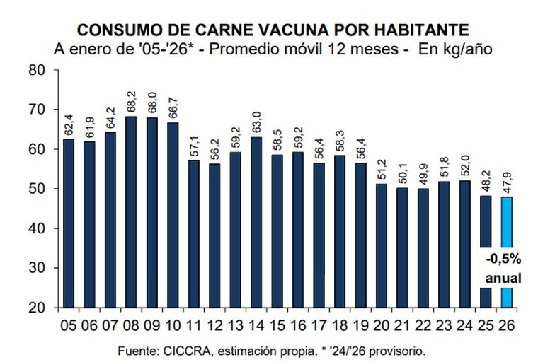 El consumo interno de carne vacuna comenzó 2026 con una fuerte retracción. En enero, el consumo aparente se redujo 13% interanual y totalizó 182,1 mil toneladas res con hueso, lo que implicó una caída de 27.100 toneladas respecto del mismo mes de 2025. En términos per cápita, el promedio móvil de los últimos doce meses se ubicó en 47,9 kilos por habitante al año, 0,5% por debajo del registro de enero del año pasado.