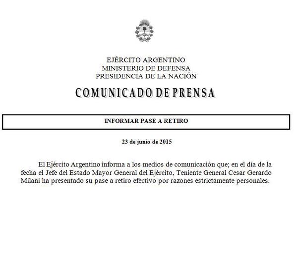 23 junio, 2015 El general Milani presentó su pase a retiro efectivo del ejercito Aquí el comunicado oficial: