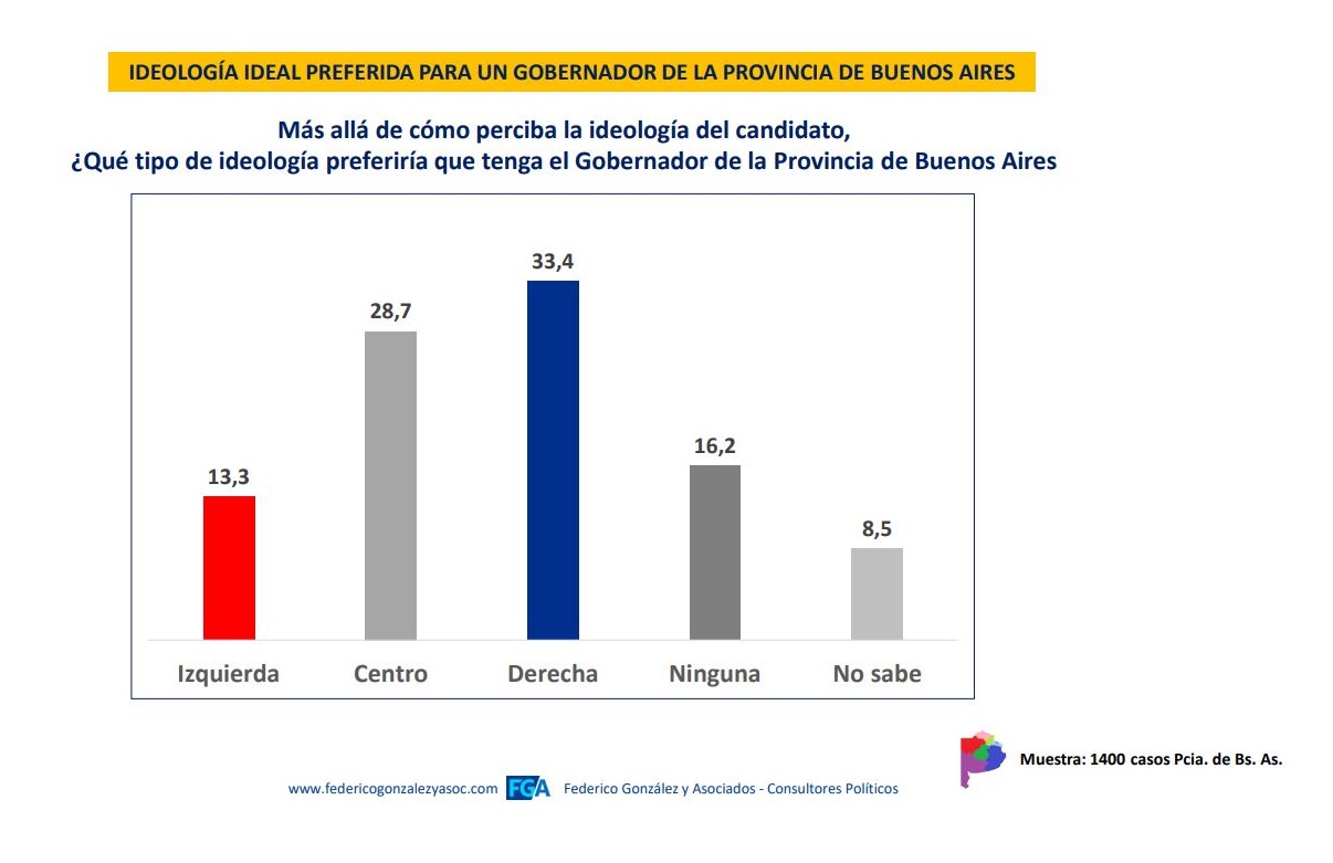 Ante la consulta sobre “¿Qué tipo de ideología preferiría que tenga el Gobernador de la Provincia de Buenos Aires? Más allá de cómo perciba la ideología del candidato”, la Derecha obtuvo la mayoría de los votos. Con un 33,4% quedó en primer lugar, seguido por el Centro con 28,7% y la Izquierda con 13,3%.