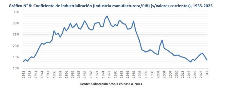 La industria manufacturera argentina atraviesa un marcado retroceso estructural. Entre 2023 y 2025, el peso del sector en el PBI cayó del 16,5% al 13,7%, una reducción de casi tres puntos porcentuales que lo ubica en niveles similares a los registrados antes de la Segunda Guerra Mundial. Los datos surgen del informe elaborado por el Área de Estudios sobre la Industria Argentina y Latinoamericana (AESIAL) y el Centro de Estudios de Historia Económica Argentina y Latinoamericana (CEHEAL) de la Facultad de Ciencias Económicas de la UBA.