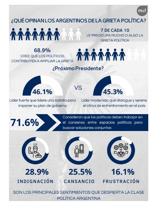 La última encuesta de Management & Fit brinda una pista de cuál es el escenario sobre el que actúan los políticos. De acuerdo con las conclusiones del monitoreo de opinión pública, los sentimientos predominantes de los argentinos sobre la clase política argentina son negativos: predominan la indignación (28,9%), el cansancio/hartazgo (25,5%) y la frustración (16,1%).