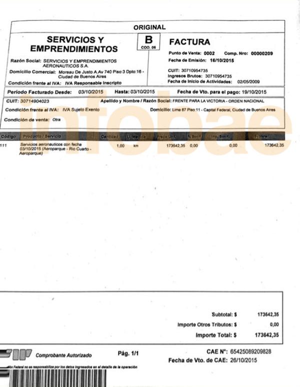 Los vuelos de cabotaje fueron facturados al CUIT 30714904023, «Frente para la Victoria Orden Nacional», creado en junio del año pasado, según los registros comerciales. Las facturas se entregaban en el piso 13 del Banco Provincia, en el microcentro, aunque el CUIT estaba registrado en Lima 87 piso 11. El pago, siempre a través de cheques, tardaba apenas algunas horas en llegar.