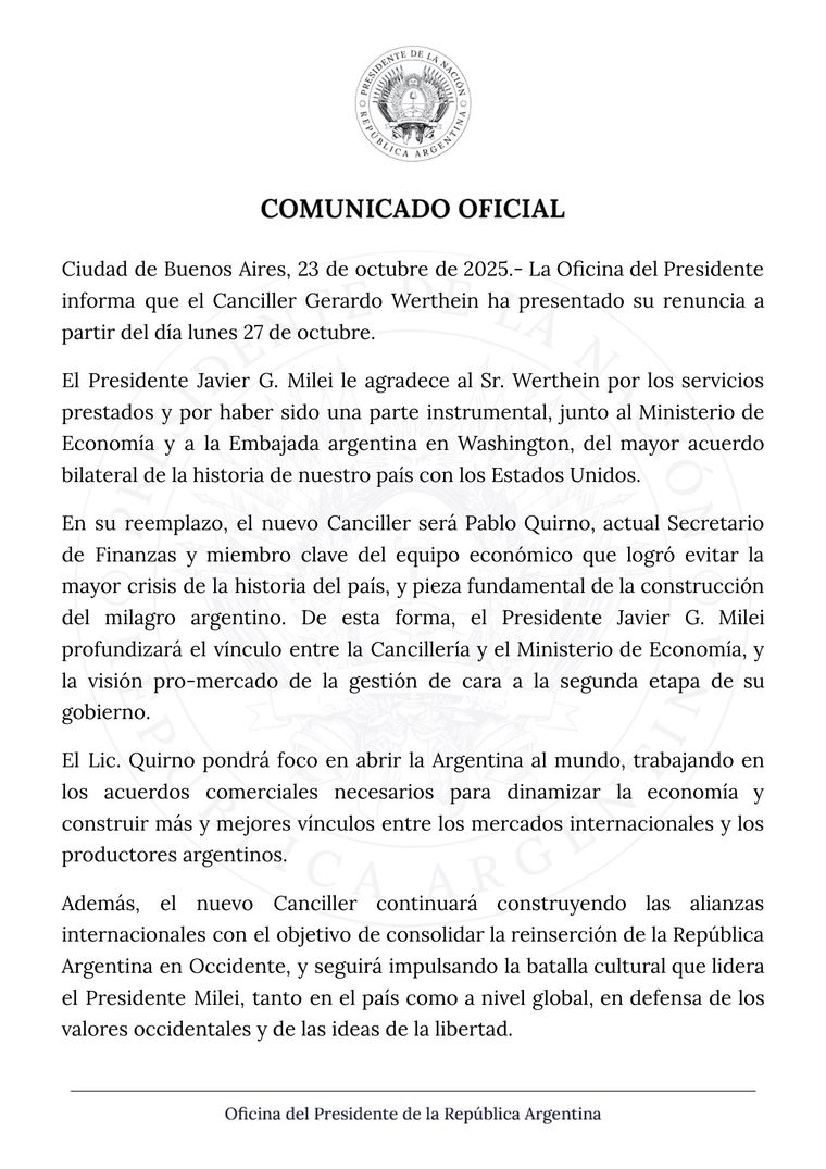 La noticia, que fuentes cercanas a Javier Milei habían anticipado a MDZ este miércoles, fue anunciada a través de un comunicado de la Oficina de la Presidencia donde el Gobierno le agradeció a Werthein por los servicios prestados y nominó a Quirno en su reemplazo.https://a5ce1afc03084fc4fc25cf726d4dcda9.safeframe.googlesyndication.com/safeframe/1-0-45/html/container.html
