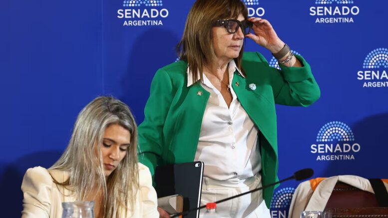 Eduardo Vischi, el jefe del bloque de la UCR en el Senado, dialoga con Patricia Bullrich, titular de la bancada libertaria