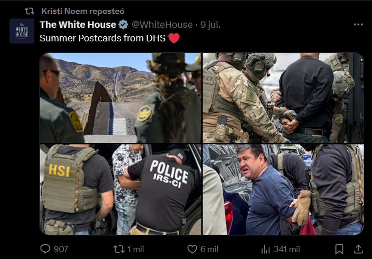 «Postales de verano del Departamento de Seguridad de Estados Unidos», el posteo que compartió Kristi Noem celebrando la detención de inmigrantes ilegales.Captura