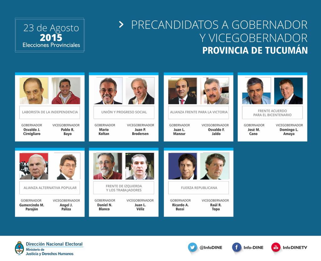 Estos son todas las fórmulas que compiten por la Gobernación de Tucumán. Los otros candidatos a gobernador son Ricardo Bussi, hijo del represor; Mario Koltan, ex funcionario de Alperovich, por Unión y Progreso Social; Daniel Blanco, del Partido Obrero; el radical Gumersindo Parajón por Alternativa Popular; y Osvaldo «Renzo» Cirnigliaro, por el Partido Laborista de la Independencia.