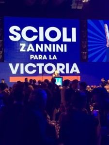 La decoración del ambiente estuvo matizada por los colores celeste y blanco, con flores colgantes y varias pantallas en las que se leía el lema: “Scioli- Zannini para la victoria”.