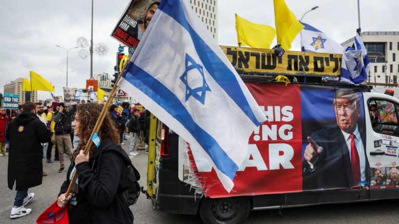 Una mujer porta una bandera israelí en Jerusalén junto a una pancarta con una imagen de Trump, durante una manifestación que pide la devolución inmediata de los rehenes el 11 de febrero. Ronen Zvulun/Reuters